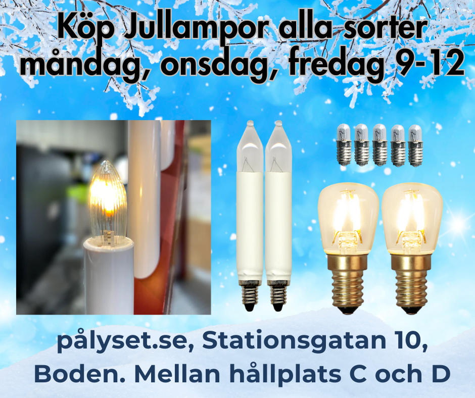 Besök oss på Stationsgatan 10 i Boden. Du kan handla över disk så hämtar vi det du söker från lagret. Fram till jul har vi jullampor framme i vår förbutik i lobbyn.