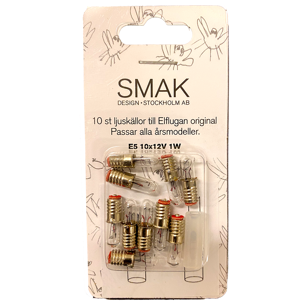 Reservlamporna i original från Smak Design AB till ljusstaken Elflugan. Dessa passar alla modeller av den ljusstaken oavsett årgång, men om du har en äldre transformator behöver du även byta transformator till en 12V-transformator. Lamporna i förpackningen är 10 st och har en effekt om 1W per lampa. Sockeln är den lilla sockeln E5.