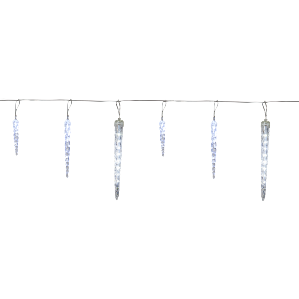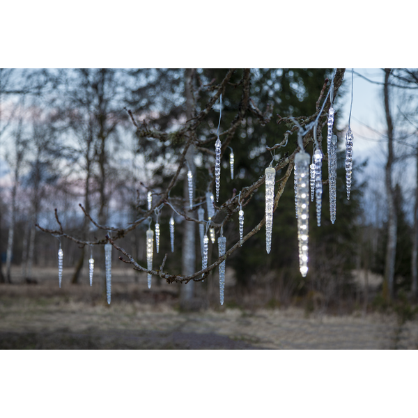 Istapparna har varierande längder för att skapa en naturlig och dynamisk effekt: den längsta istappen är 23,5 cm och har en rinnande ljuseffekt som simulerar rinnande vatten eller smältande is, de mellersta istapparna är 16 cm och de kortaste är 11 cm, båda med fast sken. Slingan är perfekt för att skapa vinterstämning längs takrännor, verandor, fönster eller entréer under vintern och julen. Med 30 cm avstånd mellan istapparna och en total längd på 700 cm får du en jämn och vacker istappseffekt.